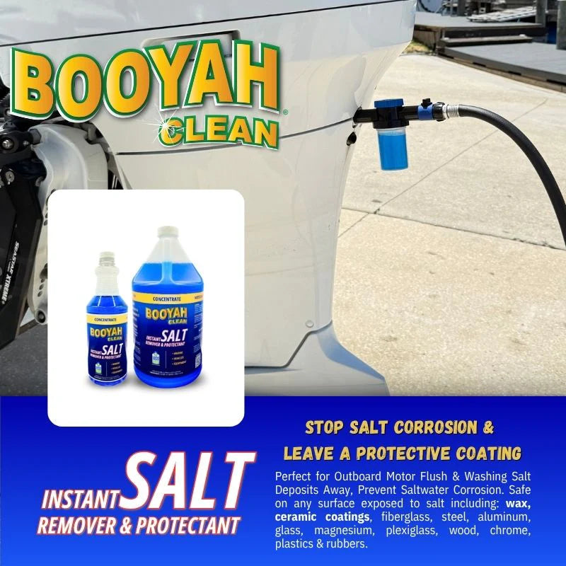 Booyah Clean Instant Salt Remover & Protectant is a concentrated formula designed to dissolve and remove embedded salt and salt residue before it can cause corrosion, surface damage, or rust. Safe for use on painted and finished surfaces, it also adds a protective barrier to help prevent future salt damage.
