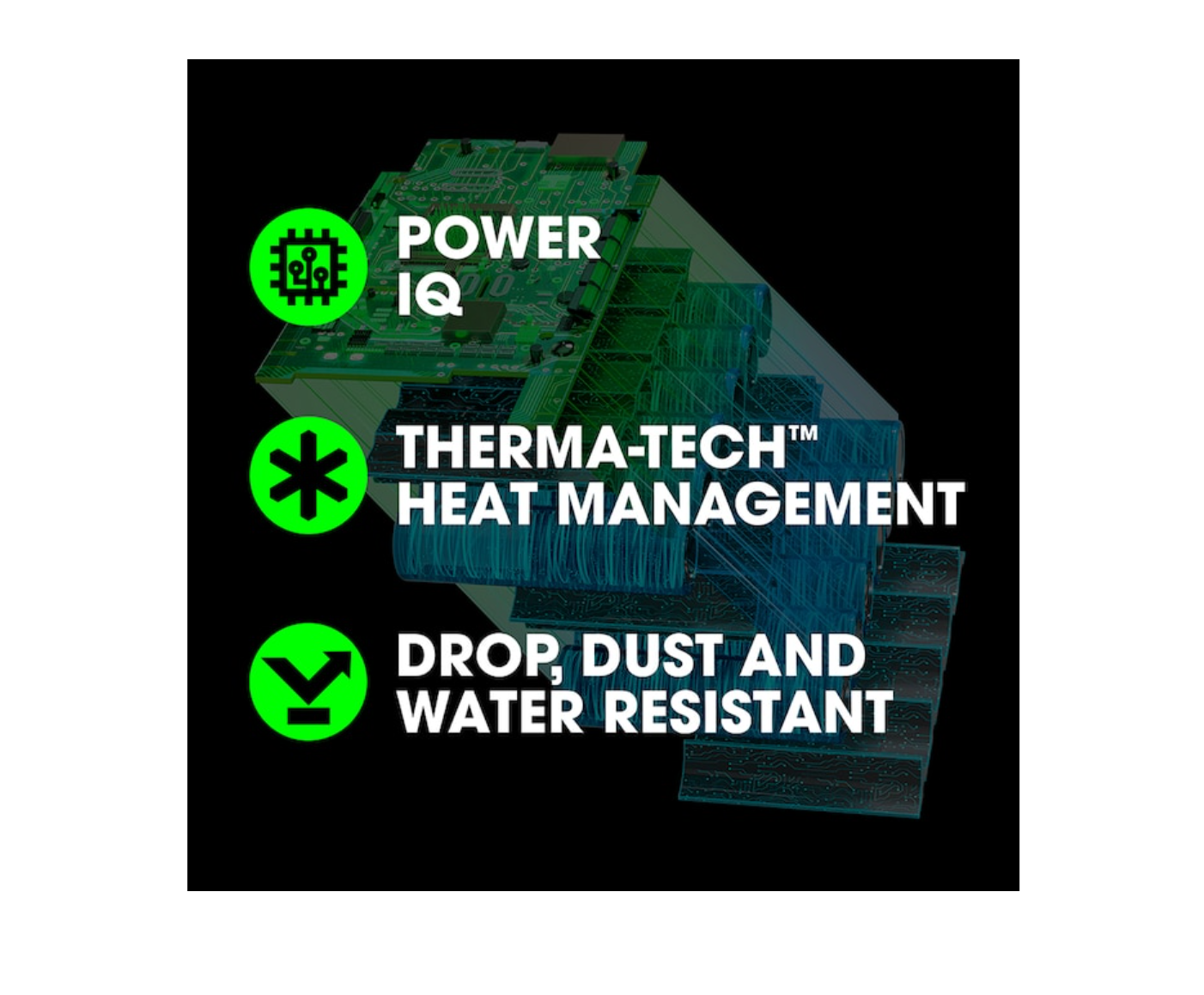 - THERMA-TECH™ HEAT MANAGEMENT - Innovative cooling system minimizes heat for 25% longer runtime